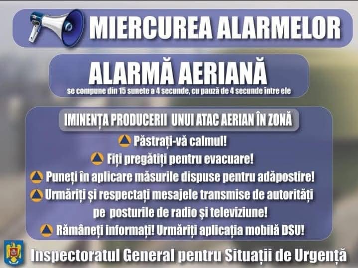 Pentru preîntâmpinarea panicii și pentru a cunoaște semnificația semnalelor de alarmare acustice, vă informăm că mâine, 26 februarie 2025, în intervalul orar 10:00-11:00, se va desfășura exercițiul de alarmare publică, denumit “MIERCUREA SIRENELOR”, pentru verificarea funcționării sirenelor, prin acționarea acestora.