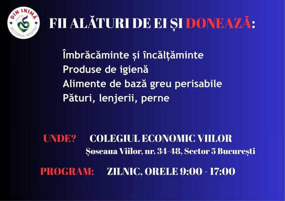 Așadar, prin intermediul Direcției de Asistență Socială și Protecția Copilului Sector 5, împreună cu Crucea Roșie Română – Filiala Sector 5 București, am deschis centrul de donații din Șoseaua Viilor nr. 34-58, aflat în incinta Colegiului Economic Viilor.