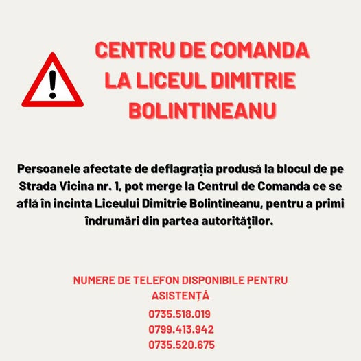 Persoanele afectate de deflagrația produsă la blocul de pe Strada Vicina nr. 1, pot merge la Centrul de Comanda ce se află în incinta Liceului Dimitrie Bolintineanu, pentru a primi îndrumări din partea autorităților.