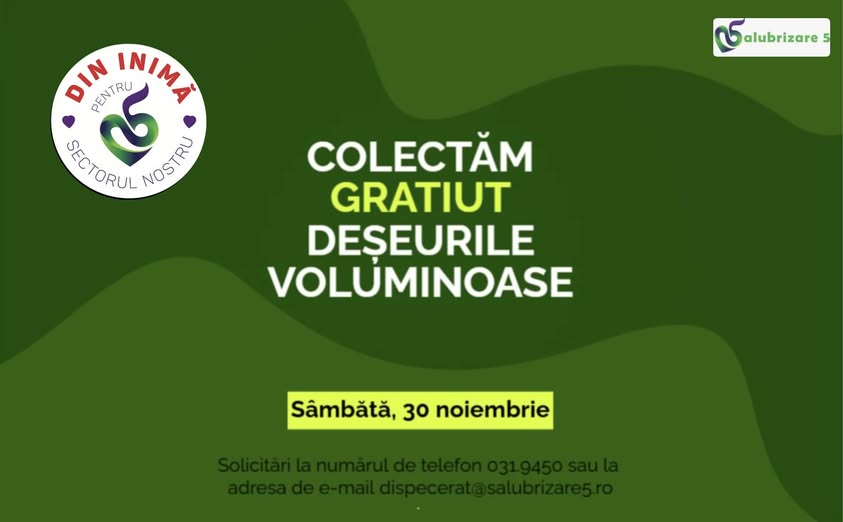 Venim în sprijinul cetățenilor Sectorului 5 și luna aceasta și colectăm, gratuit, deșeurile voluminoase (mobilier, obiecte sanitare, saltele etc.) care nu pot fi preluate cu sistemele obișnuite de colectare.