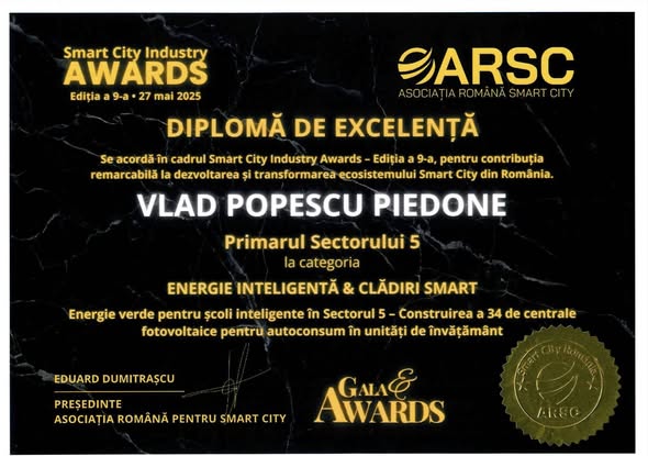 În cadrul celei de-a 9-a ediții a Galei Smart City Industry Awards, Primăria Sectorului 5 a primit două premii, acordate primarului, Vlad Popescu Piedone, pentru proiectul ce prevede construirea a 34 de centrale fotovoltaice pentru autoconsum în unități de învățământ, respectiv city managerului, Iulian Cârlogea, pentru city managerul anului, prin contribuția esențială la modernizarea administrației publice locale.