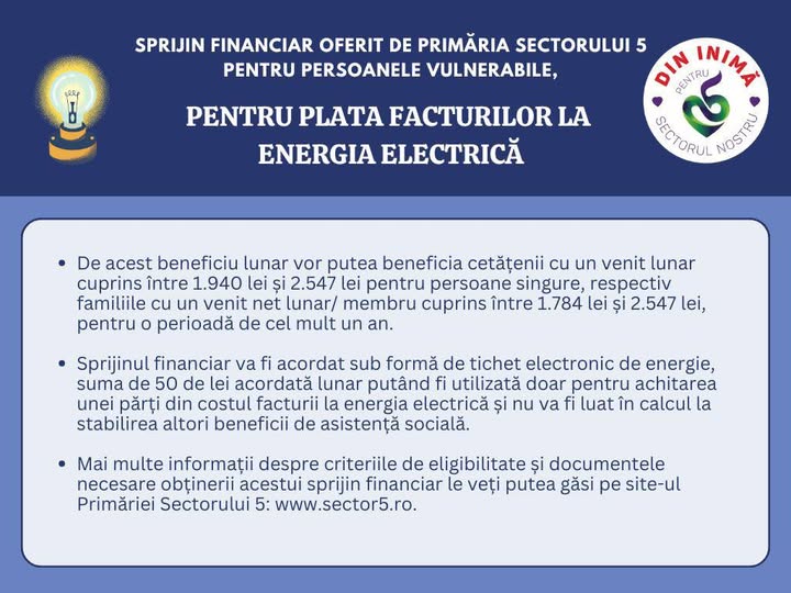 SPRIJIN FINANCIAR OFERIT DE PRIMĂRIA SECTORULUI 5 PENTRU PERSOANELE VULNERABILE, PENTRU PLATA FACTURILOR LA ENERGIA ELECTRICĂ
