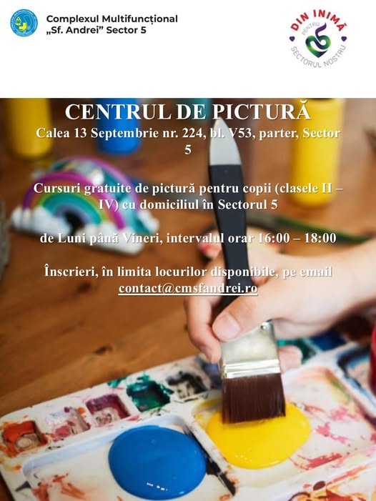 Plecând de la motto-ul ”Visele tale pot prinde culoare”, Primăria Sectorului 5, prin Complexul Multifuncțional ”Sfântul Andrei”, deschide Centrul pentru pictură, un loc unde copiii din Sectorul 5 pot învăța tainele și semnificația culorilor și cum să își aleagă culorile potrivite pentru a da viață imaginației creației lor.